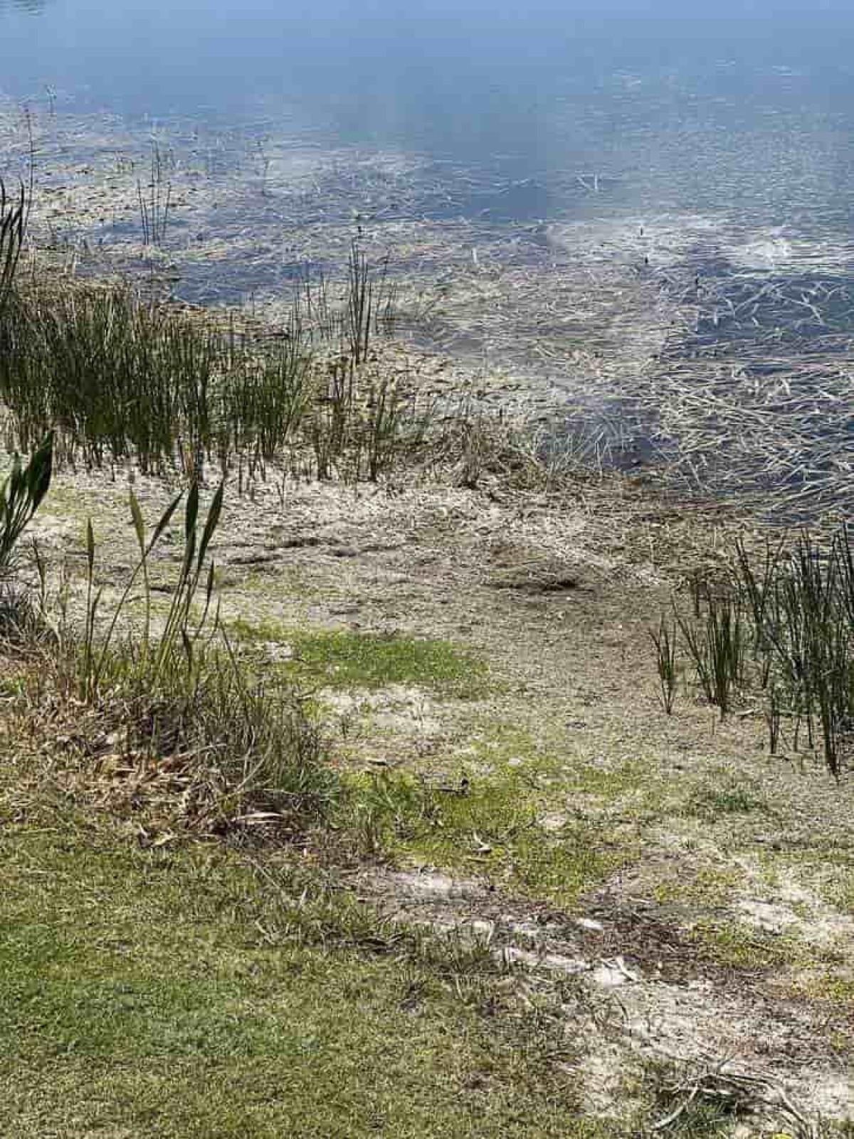 Yukarıdaki görselde bir göl manzarası yer alıyor. Suda gizlenen bir timsah var.
