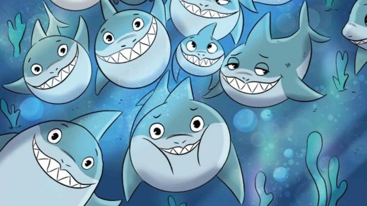 Şimdi, gerçek eğlence başlıyor. Sırada, hepsi aptalca gülümsemeler sergileyen çizgi film köpekbalıklarının yer aldığı bir resim var. Bunların arasında öne çıkan ve ait olmayan küçük bir balık var.