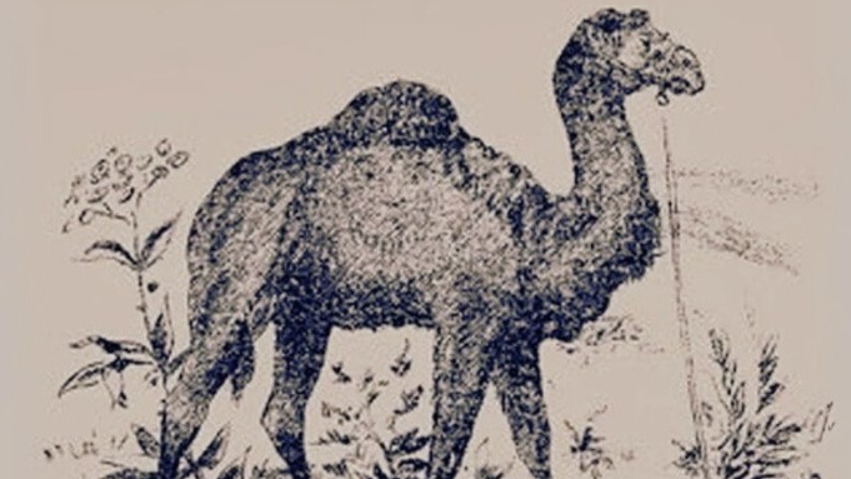 Yukarıda paylaşılan vintage optik illüzyon görselinde, çölü andıran bir manzarada, çok seyrek bitki örtüsüyle çevrili bir yerde mahsur kalmış bir deve görülüyor.