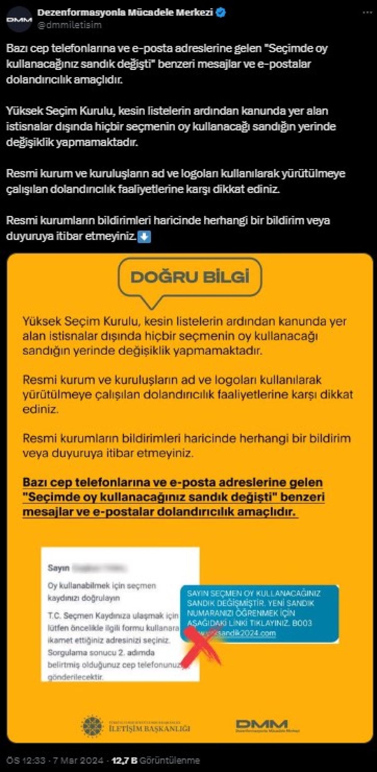 Ayrıca DMM’nin yaptığı açıklamanın detaylarında, “Bazı cep telefonlarına ve e-posta adreslerine gelen "Seçimde oy kullanacağınız sandık değişti" benzeri mesajlar ve e-postalar dolandırıcılık amaçlıdır.