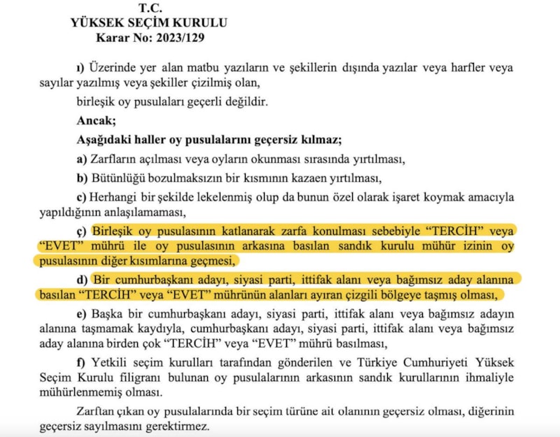 d) "Bir cumhurbaşkanı adayı, siyasi parti, ittifak alanı veya bağımsız aday alanına basılan "TERCİH" veya "EVET" mührünün alanları ayıran çizgili bölgeye taşmış olması" oy pusulalarını geçersiz kılmaz.
