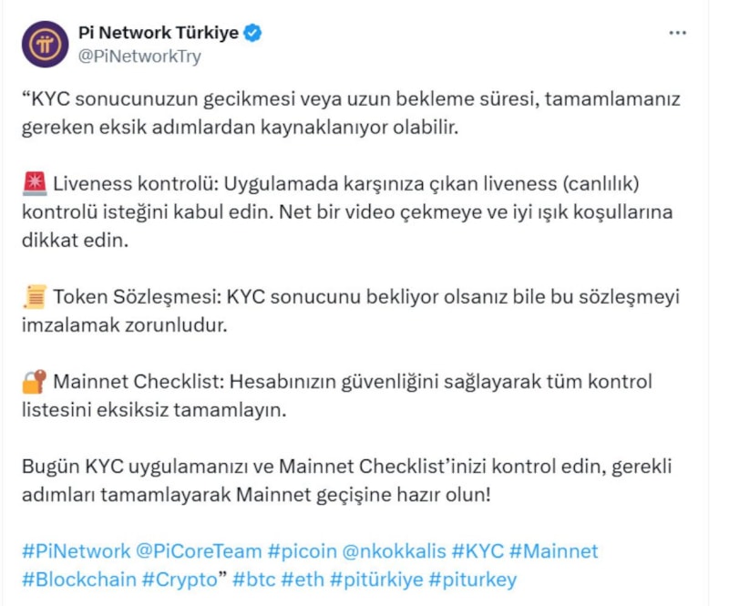Pi Network Türkiye, X hesabından "KYC doğrulaması" hakkında paylaşım yaptı.