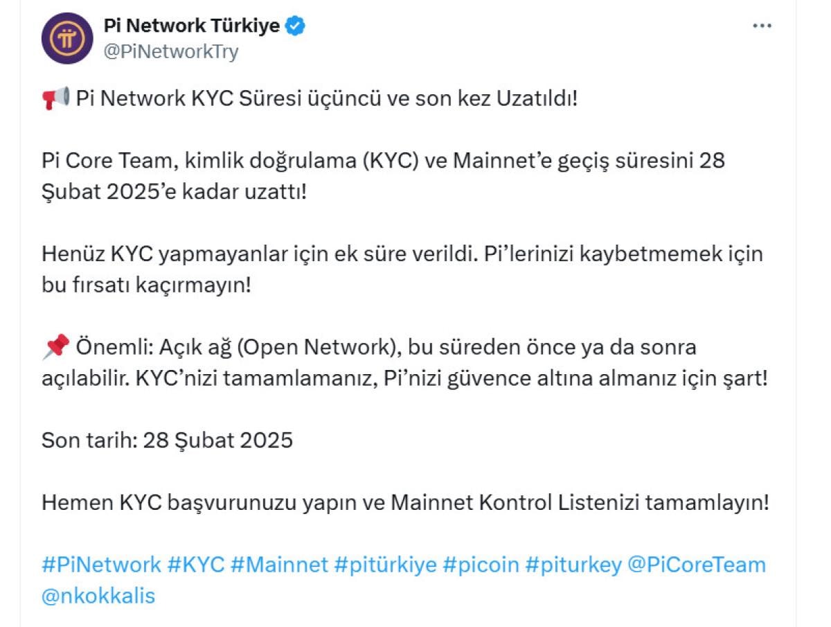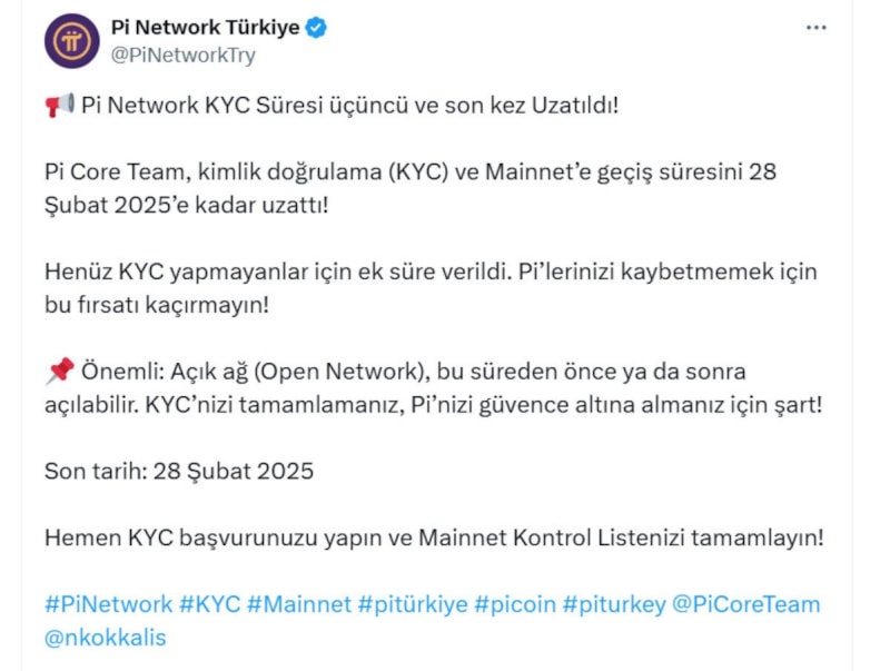 "Pi Core Team, kimlik doğrulama (KYC) ve Mainnet’e geçiş süresini 28 Şubat 2025’e kadar uzattı!