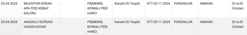Bakanlığın yayınladığı listeye göre Ankara'da yer alan Muzaffer Kodak Apa Pide Kebap Salonu ve Anadolu Sofrası'nda yapılan pişmemiş kıymalı pide harcında kanatlı eti tespit edildi.