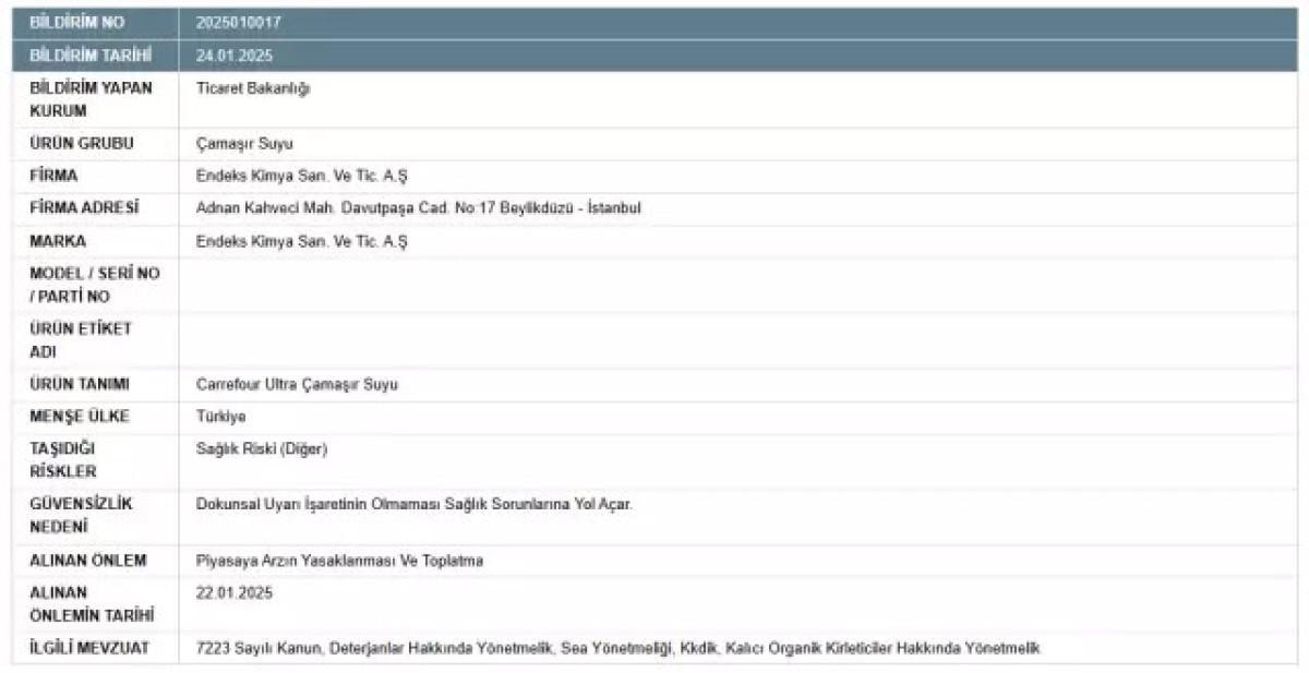 GÜBİS üzerinden ilan edilen ürünleri arasına bu kez meşhur çamaşır suyu markası eklendi. Bakanlık'tan yapılan açıklamaya göre; Endeks Kimya San. Ve Tic. A.Ş tarafından üretilen "Carrefour Ultra Çamaşır Suyu" adlı ürünün satışı yasaklanırken daha önce satılan adetlerin de piyasadan toplatılmasına karar verildi.