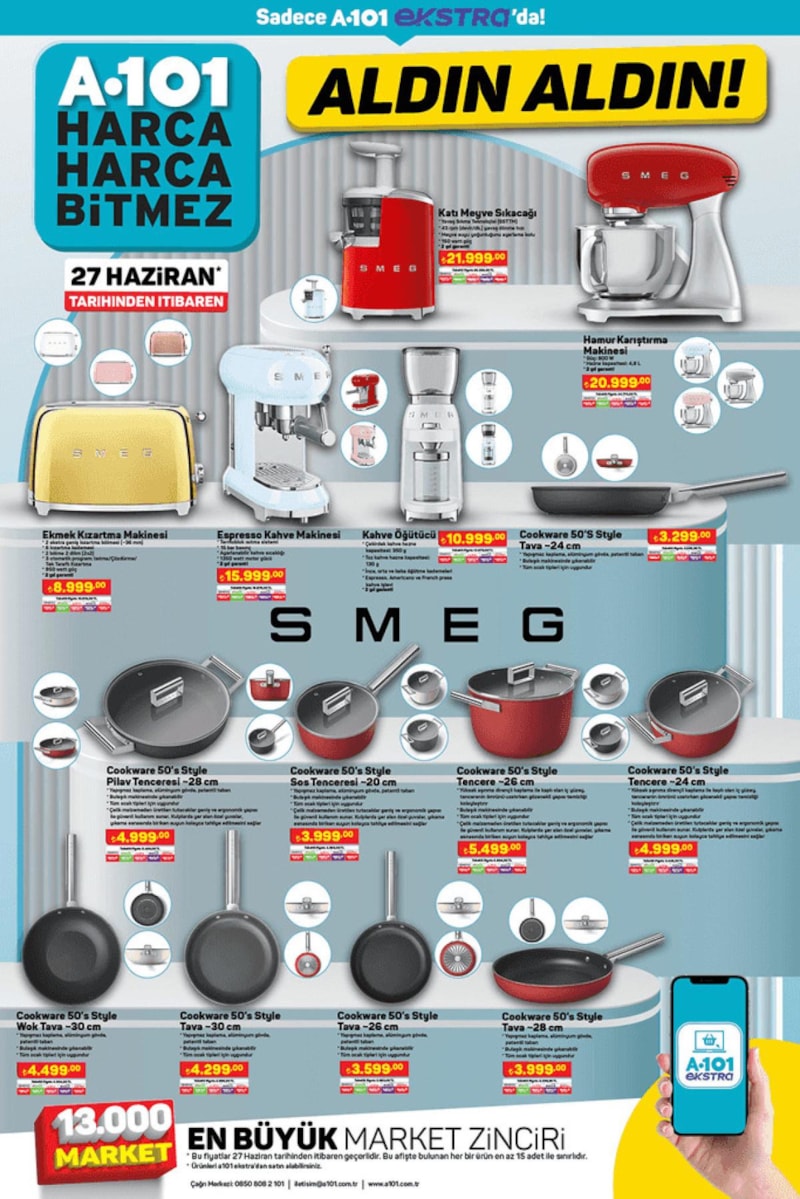 Tencere, tava, kahve makinesi, hamur yoğurucu, ekmek kızartma makinesi gibi seçenekleri sunan A101, SMEG almak isteyenleri cezbetti.