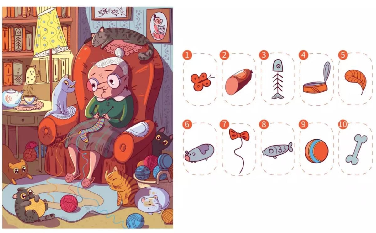 Evinde örgü ören yaşlı kadın ve kedilerinin yer aldığı görselde 10 gizli nesnemiz bulunuyor.