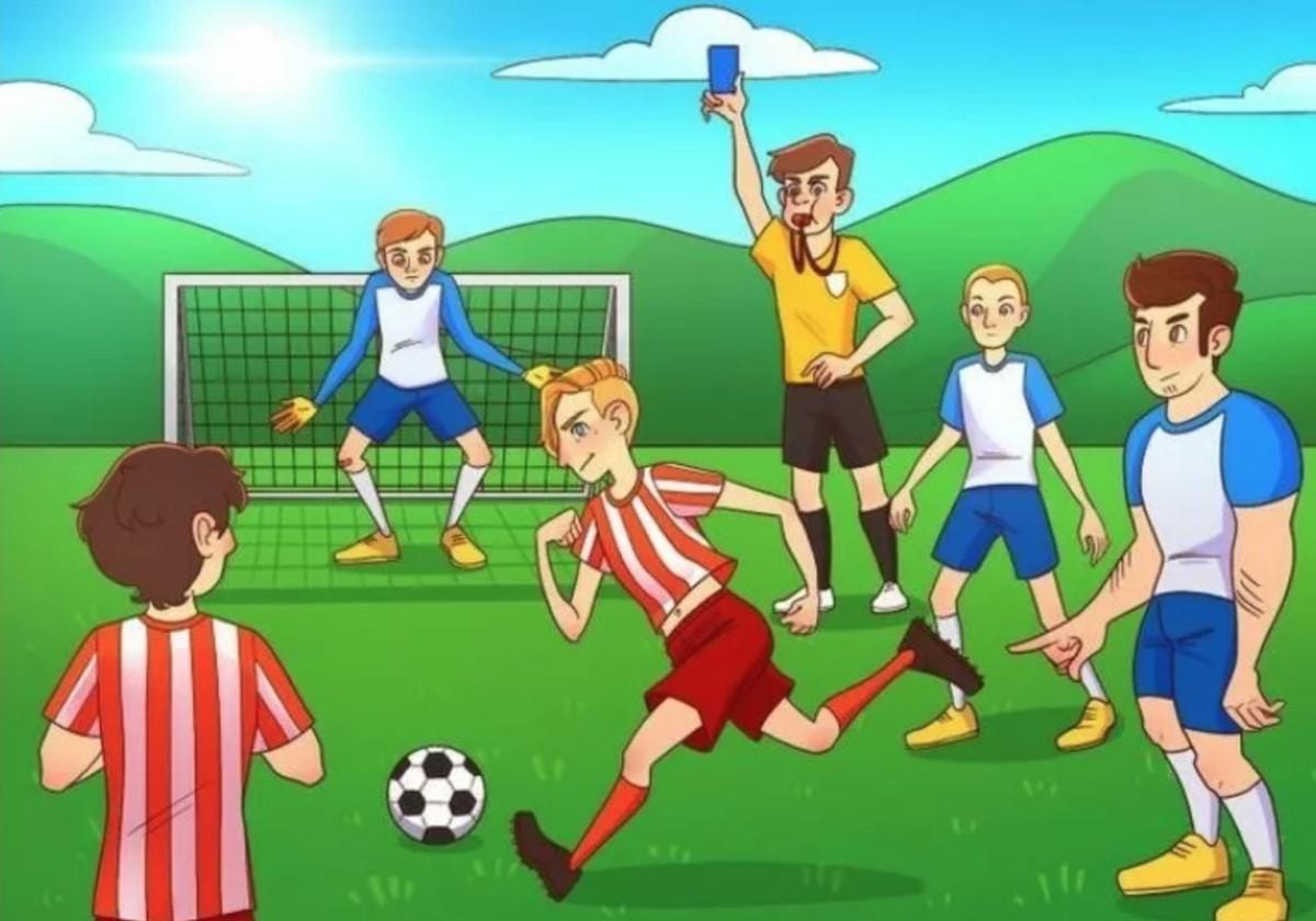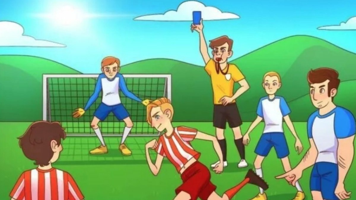 Resimde futbol maçı yapan çocuklar ve bir hakem yer alıyor. Bu resimde bir mantık hatası bulunuyor.