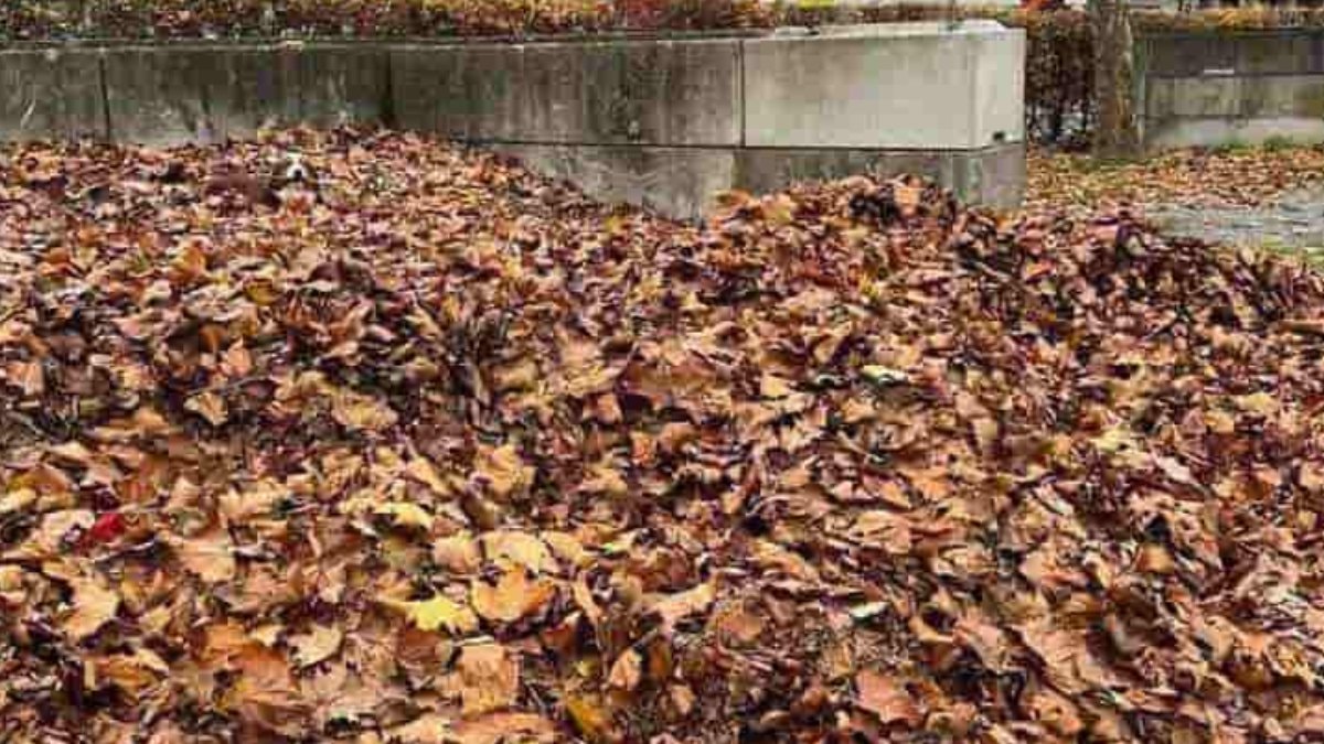 Resmin ön kısmında bir yığın yaprak, arka planda ise bir sıra bina görülüyor.
