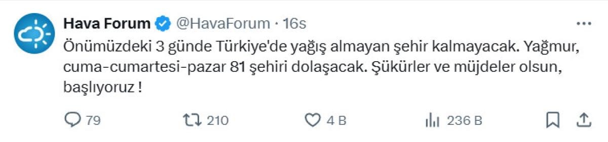X hesabından yapılan paylaşımda, "Önümüzdeki 3 günde Türkiye'de yağış almayan şehir kalmayacak. Yağmur, cuma-cumartesi-pazar 81 şehiri dolaşacak. Şükürler ve müjdeler olsun, başlıyoruz" denildi.