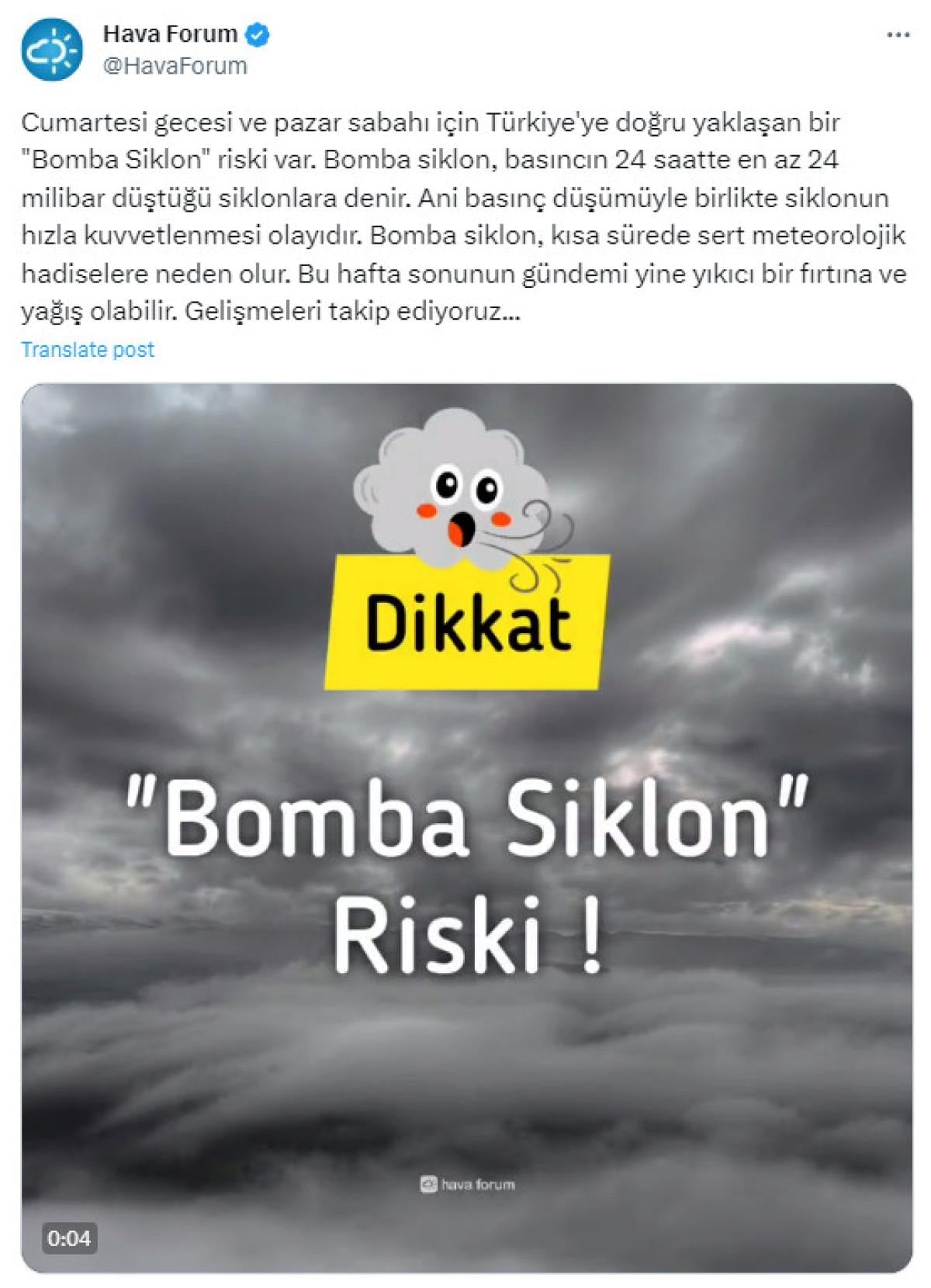 "Cumartesi gecesi ve pazar sabahı için Türkiye'ye doğru yaklaşan bir "Bomba Siklon" riski var. Bomba siklon, basıncın 24 saatte en az 24 milibar düştüğü siklonlara denir. Ani basınç düşümüyle birlikte siklonun hızla kuvvetlenmesi olayıdır. Bomba siklon, kısa sürede sert meteorolojik hadiselere neden olur. Bu hafta sonunun gündemi yine yıkıcı bir fırtına ve yağış olabilir. Gelişmeleri takip ediyoruz"