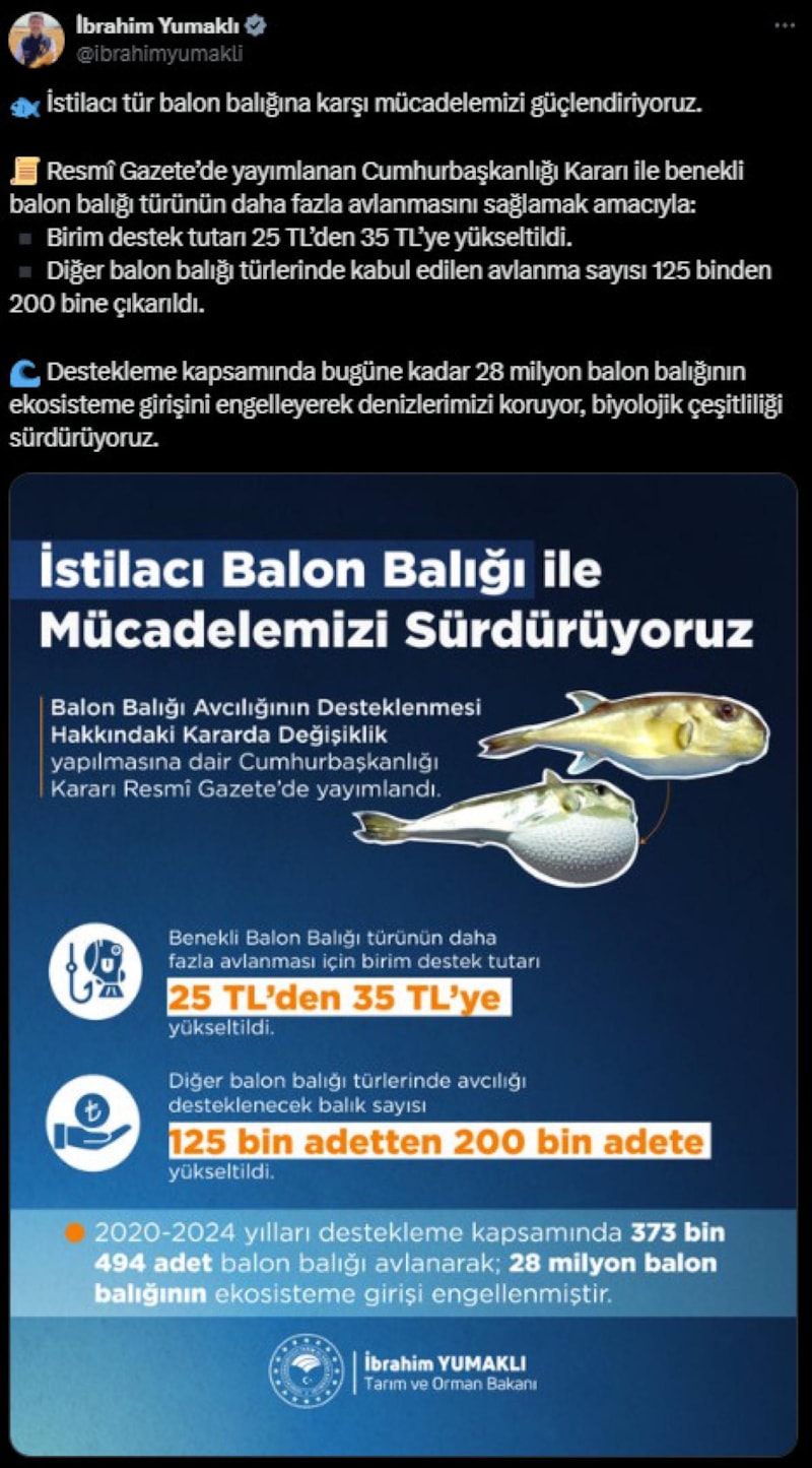 Tarım ve Orman Bakanı İbrahim Yumaklı, sosyal medya hesabından yaptığı açıklamayla balon balığı avlayanlara yönelik yeni destek paketini kamuoyuna duyurdu.