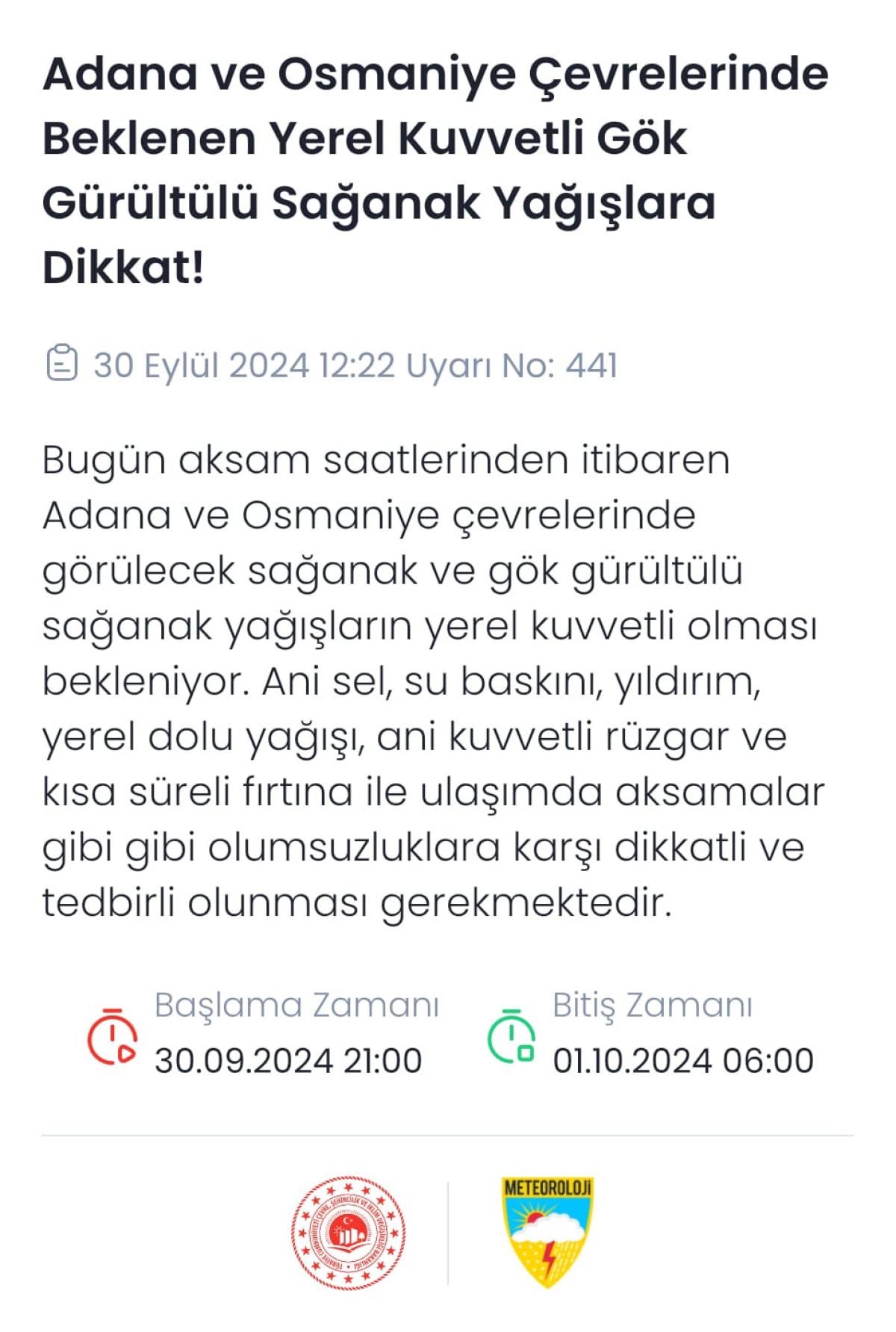 Özellikle Adana ve Osmaniye çevresinde yaşayanların dikkatli olmaları gerektiği belirtildi.