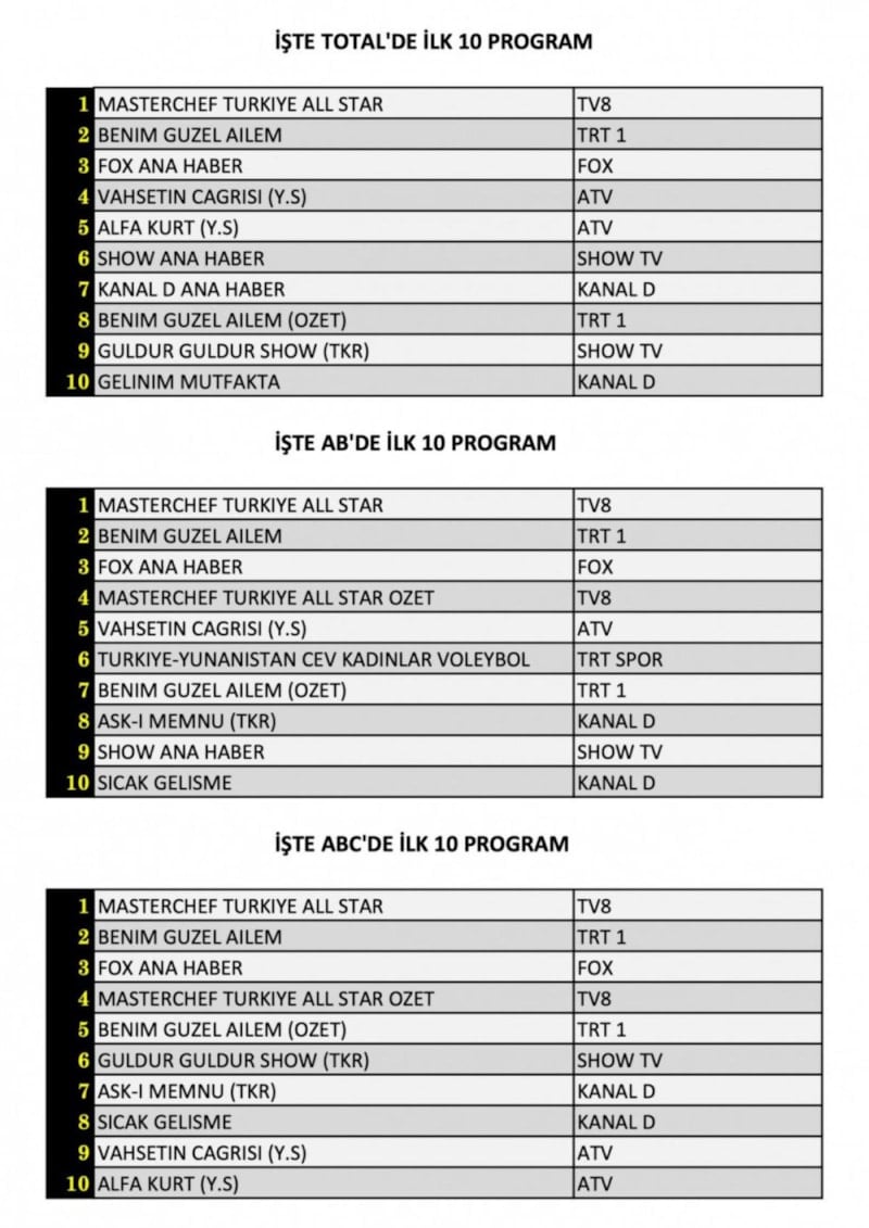 Her gün bir önceki güne ait Total, AB ve ABC sıralaması belli olurken dünün reyting sonuçları merakla bekleniyor.