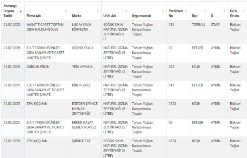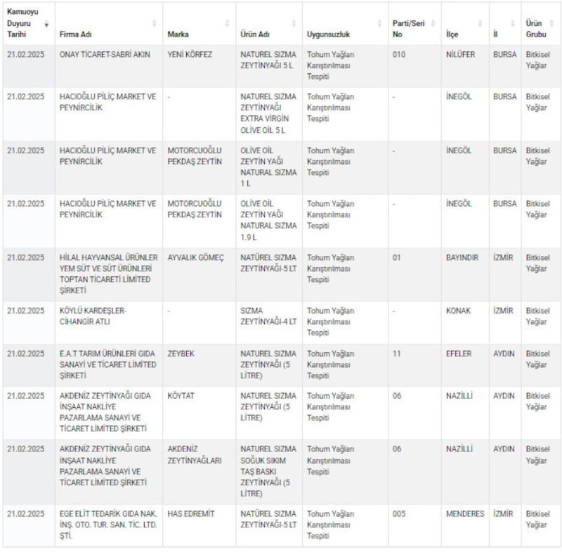 Tarım ve Orman Bakanlığı, gıda güvenliği denetimlerini sürdürüyor ve taklit-tağşiş yapan firmaları bir bir ifşa etmeye devam ediyor. Son yayımlanan listede 10 ünlü zeytinyağı markası yer aldı. İçlerinden bakın neler çıktı...