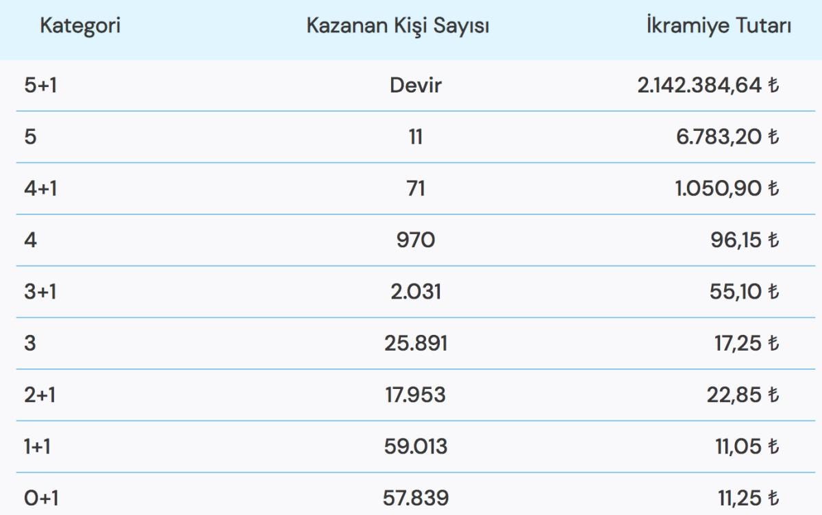 Bugün akşam yapılan çekiliş sonuçlarına göre 5+1 bilen çıkmadığı için 2.142.384,64 TL'lik büyük ikramiye devretti.