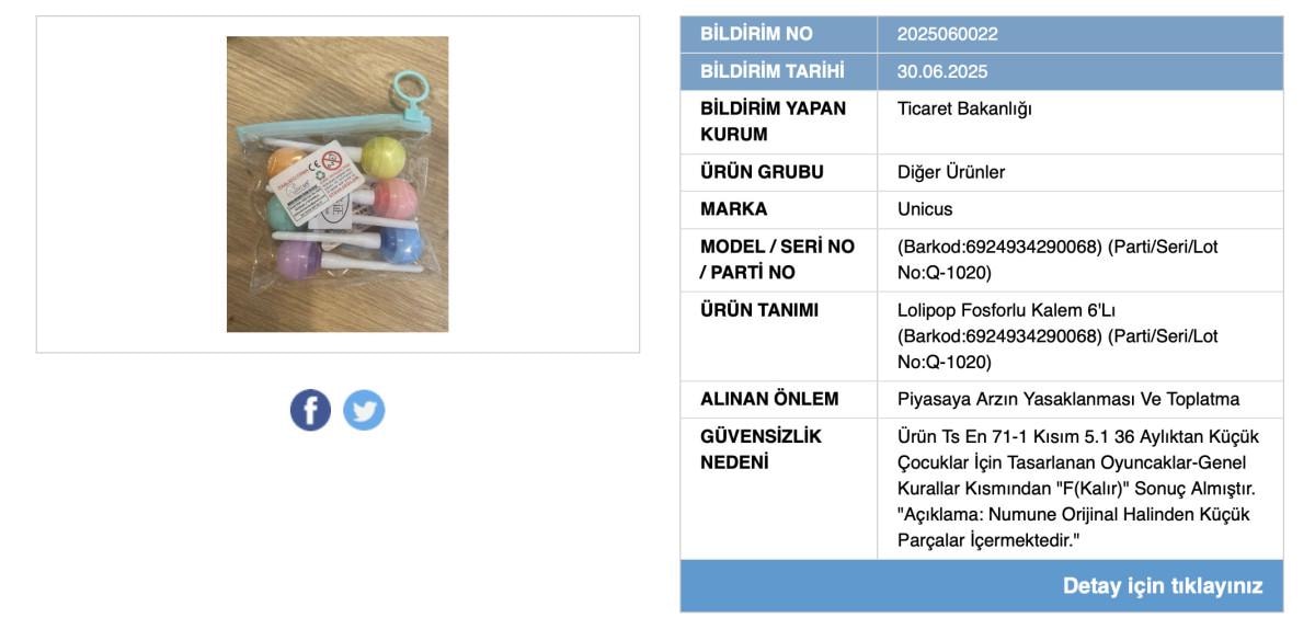 Yapılan testler sonucunda, ürünün küçük parça riski taşıdığı ve 36 aydan küçük çocuklar için tehlike oluşturduğu tespit edildi.
