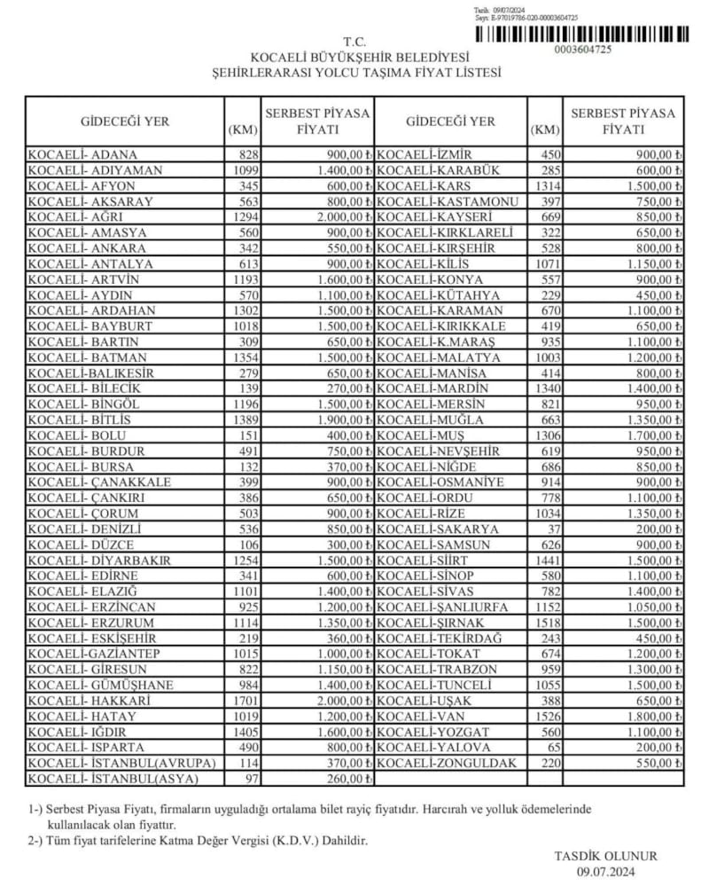 Yapılan yüzde 30 zamdan sonra, Kocaeli çıkışlı şehirler arası otobüs bilet fiyatları şu şekilde güncellendi:
