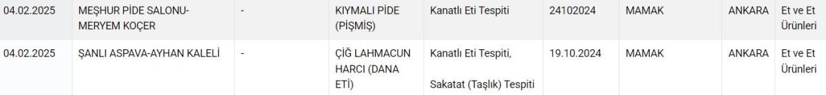 Bakanlığın yayınladığı yeni listeye göre Ankara Mamak’ta yer alan Meşhur Pide Salonu’nda kıymalı pidenin içerisinde kanatlı eti tespit edildi.