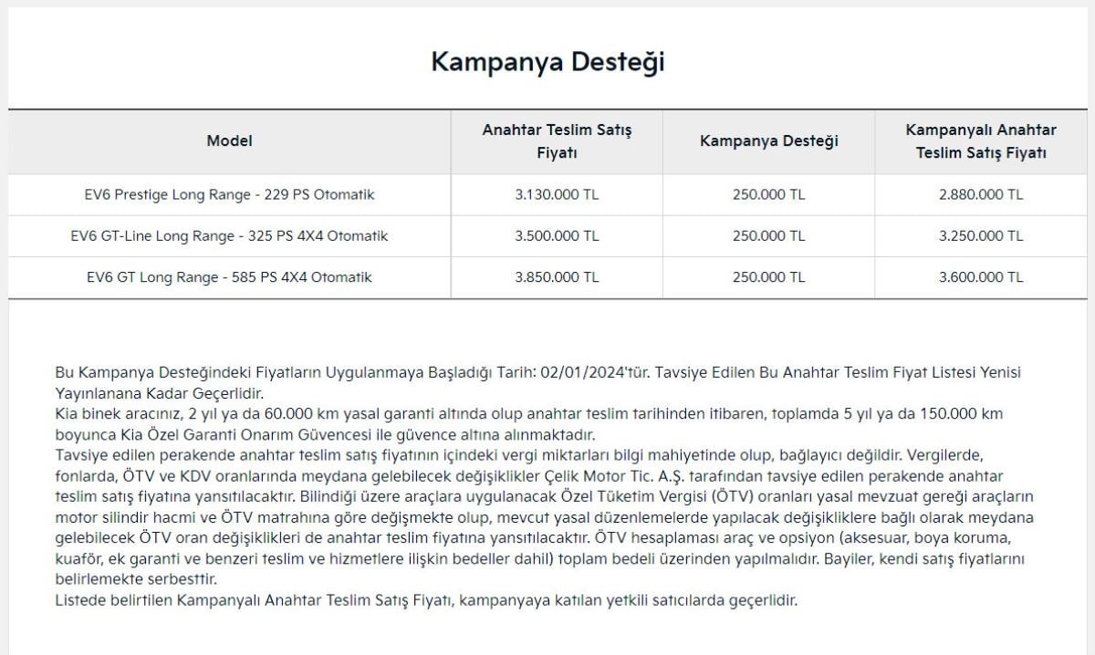 Kampanya kapsamında, 229 PS Otomatik Elektrikli Prestige Long Range 2023 model EV6 için kampanyalı fiyat 2.880.000 TL olarak belirlenirken, 585 PS 4X4 Otomatik Elektrikli GT Long Range 2023 model EV6 kampanyalı fiyatı ise şaşırtıcı bir şekilde 3.600.000 TL'ye düşüyor.