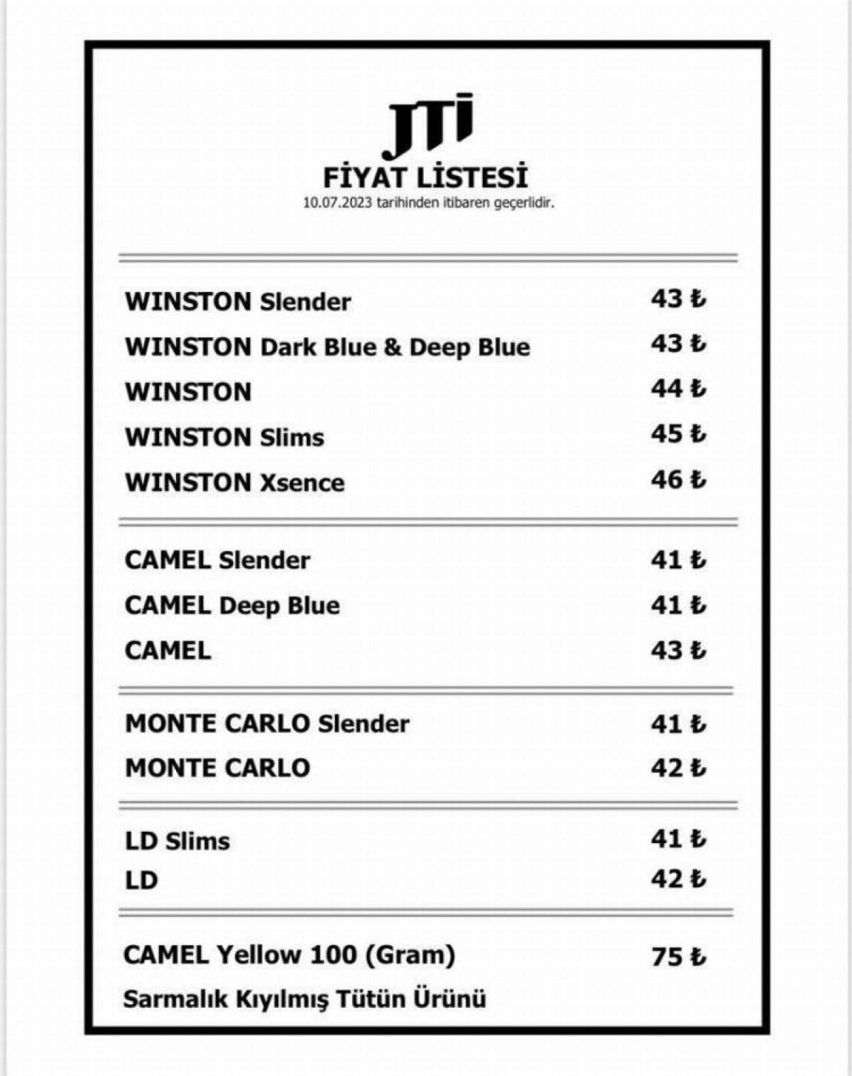 Son olarak JTİ grubu ürünlerine 5 TL’lik zam geldi. Bununla birlikte en düşük sigara 41 TL olurken, en yüksek sigara fiyatı ise 46 TL oldu. İşte yeni fiyat listesi…