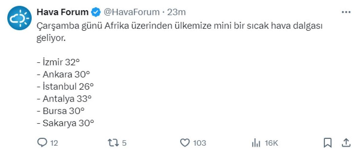 Meteoroloji Kaynağı, X hesabından yeni bir hava dalgası geleceğini duyurdu. Paylaşımında şu ifadelere yer verdi: