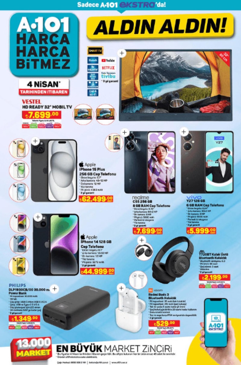 4 Nisan Perşembe tarihli A101 İnternete Özel Aldın Aldın Kataloğu'nda, özellikle iPhone 14 ve iPhone 15 Plus gibi teknoloji harikaları dikkatleri hemen üzerine çekti.