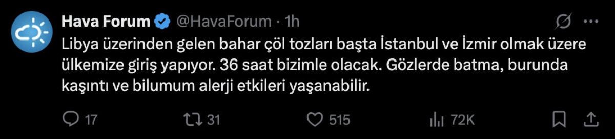 “Libya üzerinden gelen bahar çöl tozları başta İstanbul ve İzmir olmak üzere ülkemize giriş yapıyor. 36 saat bizimle olacak. Gözlerde batma, burunda kaşıntı ve bilumum alerji etkileri yaşanabilir.”