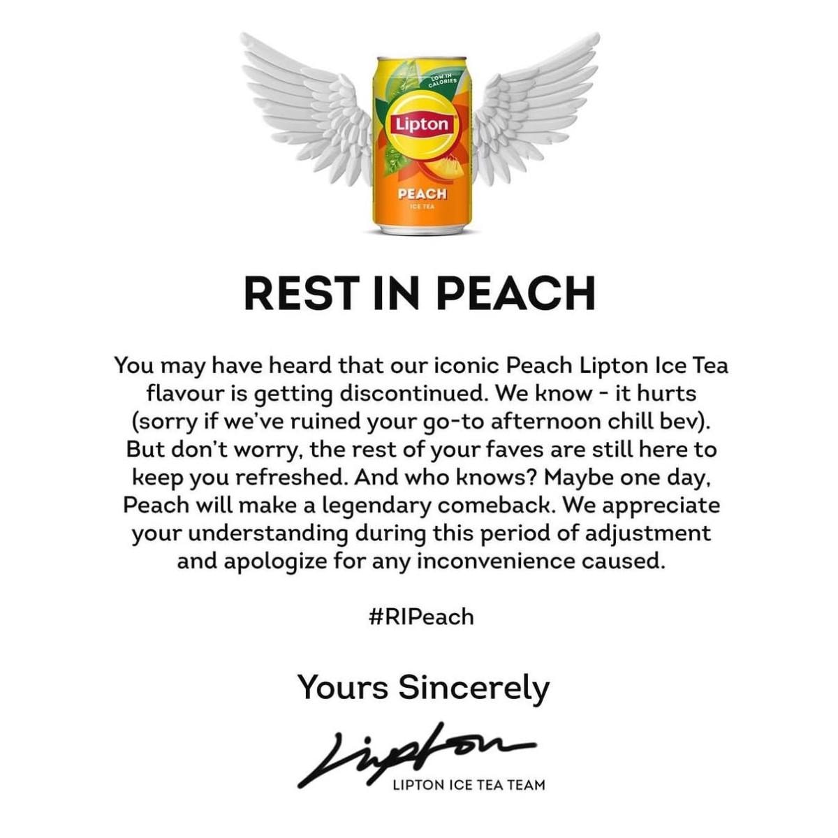 "İkonik Şeftali Lipton Ice Tea aromamızın üretiminin durdurulduğunu duymuş olabilirsiniz. Biliyoruz - canınız yanıyor (öğleden sonra içtiğiniz rahatlatıcı içeceği mahvettiysek özür dileriz). Ama endişelenmeyin, diğer favorileriniz sizi taze tutmak için hala burada. Ve kim bilir? Belki bir gün, Peach efsanevi bir geri dönüş yapar."