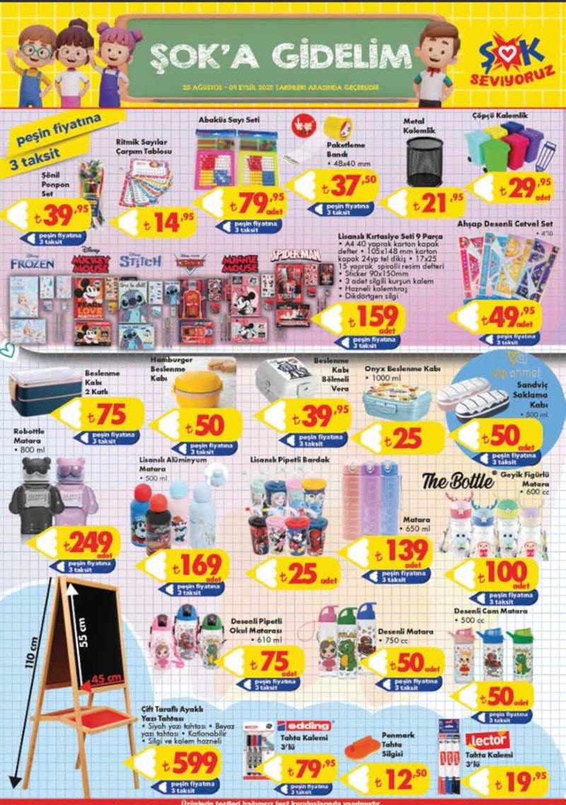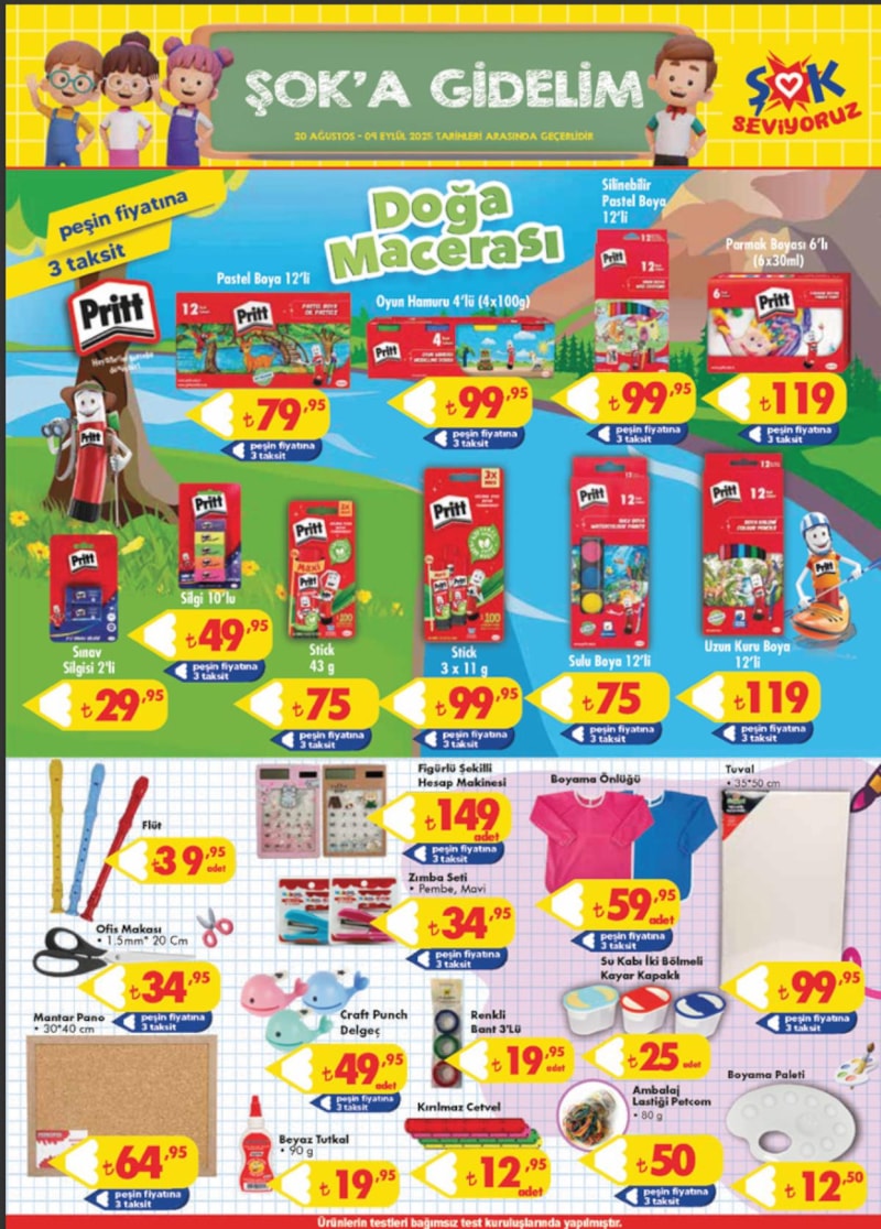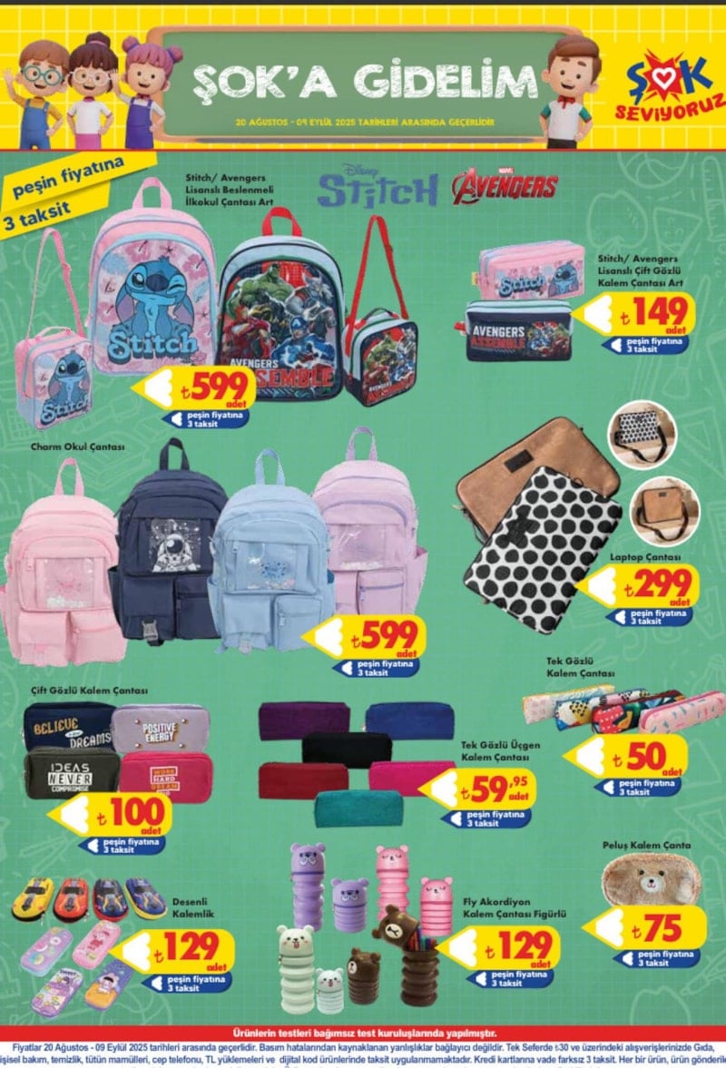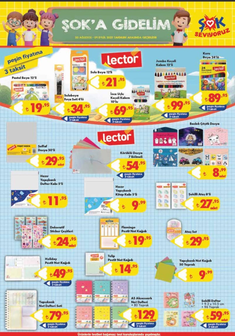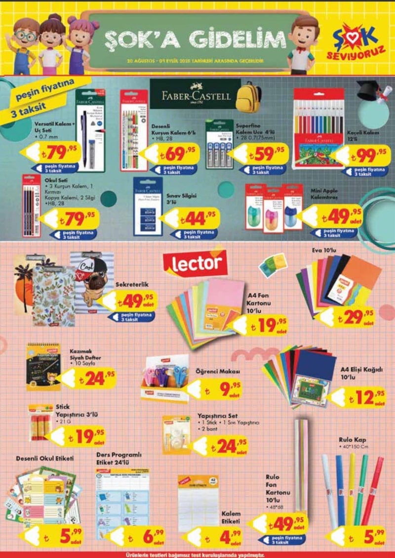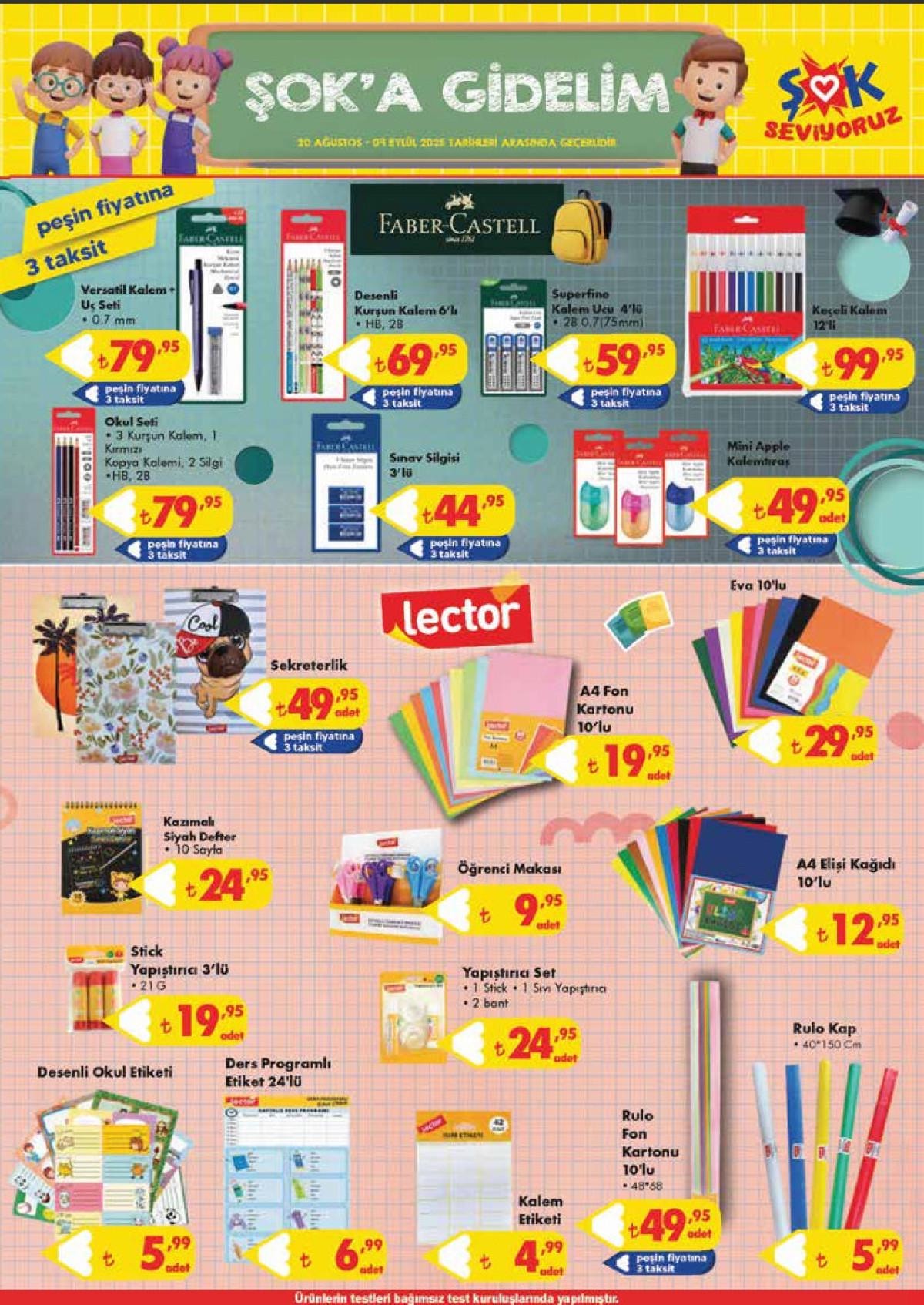 Bu kapsamda ŞOK Market, her yıl olduğu gibi 2025 eğitim-öğretim dönemi öncesinde defter, kalem, silgi, boya setleri, kalemtıraş, cetvel takımları ve okul çantalarını aktüel kataloğuna dahil etti.