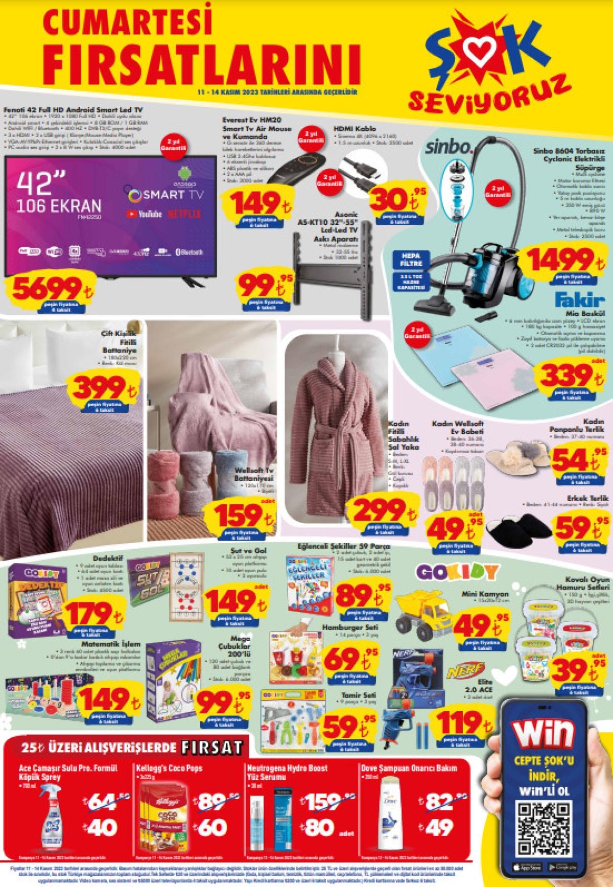 ŞOK marketlerinin 11-14 Kasım 2023 tarihleri arasında geçerli olacak aktüel kataloğunda, müşterilere özel indirimler ve sınırlı sayıda ürün yer alacak.
