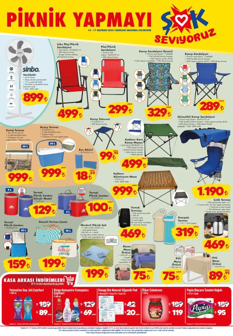Kampanyada, Sinbo marka vantilatör 899 TL'den satışa sunulurken, plaj ve kamp sandalyeleri modeline göre 289 TL ile 1.190 TL arasında değişen fiyatlarla raflardaki yerini alıyor.