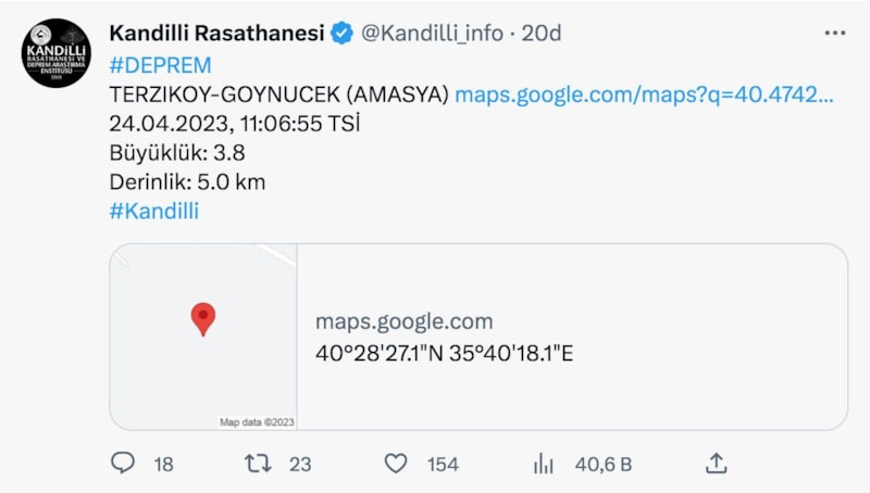 Kandilli Rasathanesi, Amasya, Terziköy-Göynücek'te 3.8 büyüklüğünde bir deprem meydana geldiğini açıkladı.