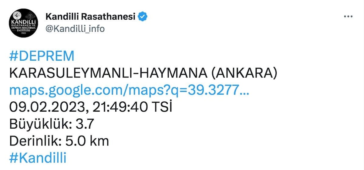 Kandilli Rasathanesi, Ankara, Karasüleymanlı - Haymana merkezli bir deprem meydana geldiğini açıkladı.