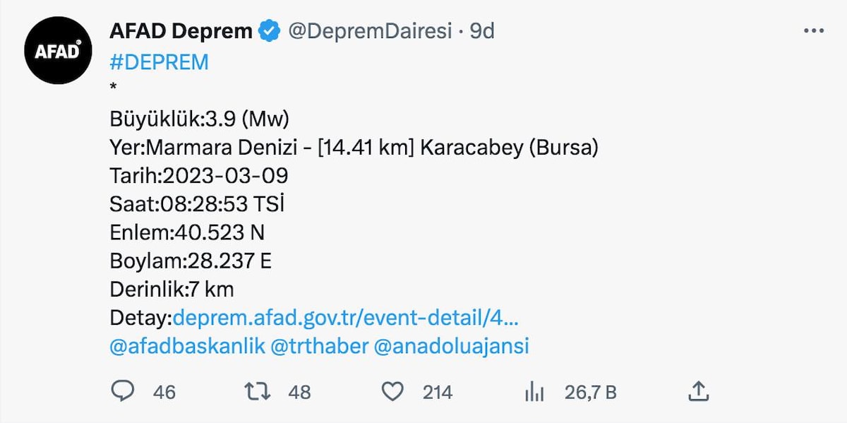 AFAD, Bursa Karacabey merkezli bir deprem meydana geldiğini açıkladı.