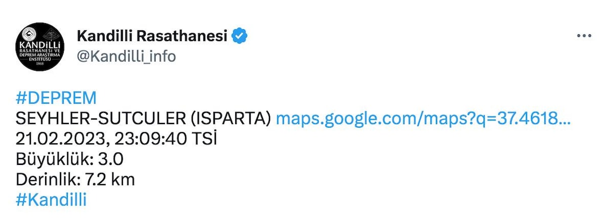 Ayrıca Isparta Şeyhler-Sütçüler'de saat 23:09:40'da ve 7.2 km derinlikte 3.0 büyüklüğünde bir deprem daha meydana geldiği açıklanmıştı.