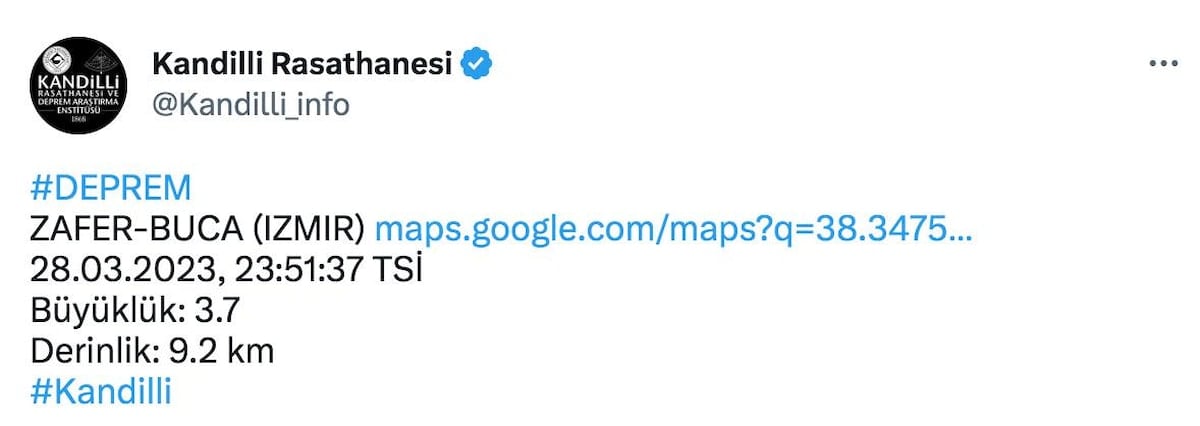 Kandilli Rasathanesi, İzmir, Zafer-Buca merkezli bir deprem meydana geldiğini açıkladı.