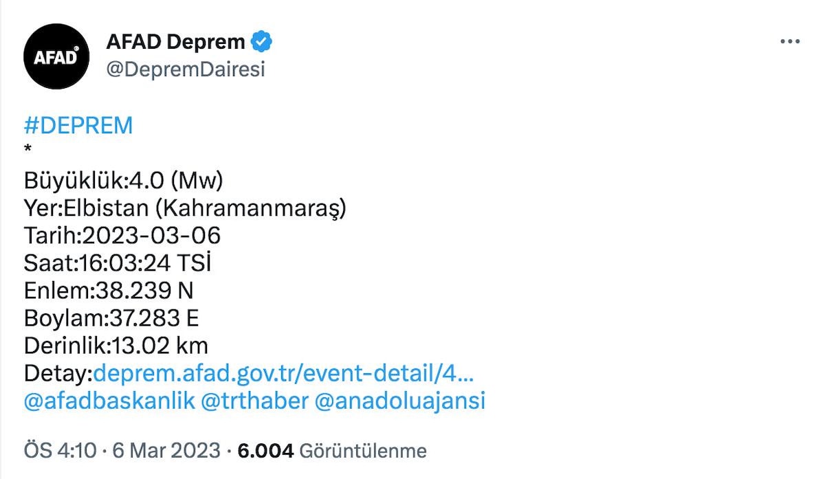 AFAD, Kahramanmaraş Elbistan merkezli bir deprem meydana geldiğini açıkladı.