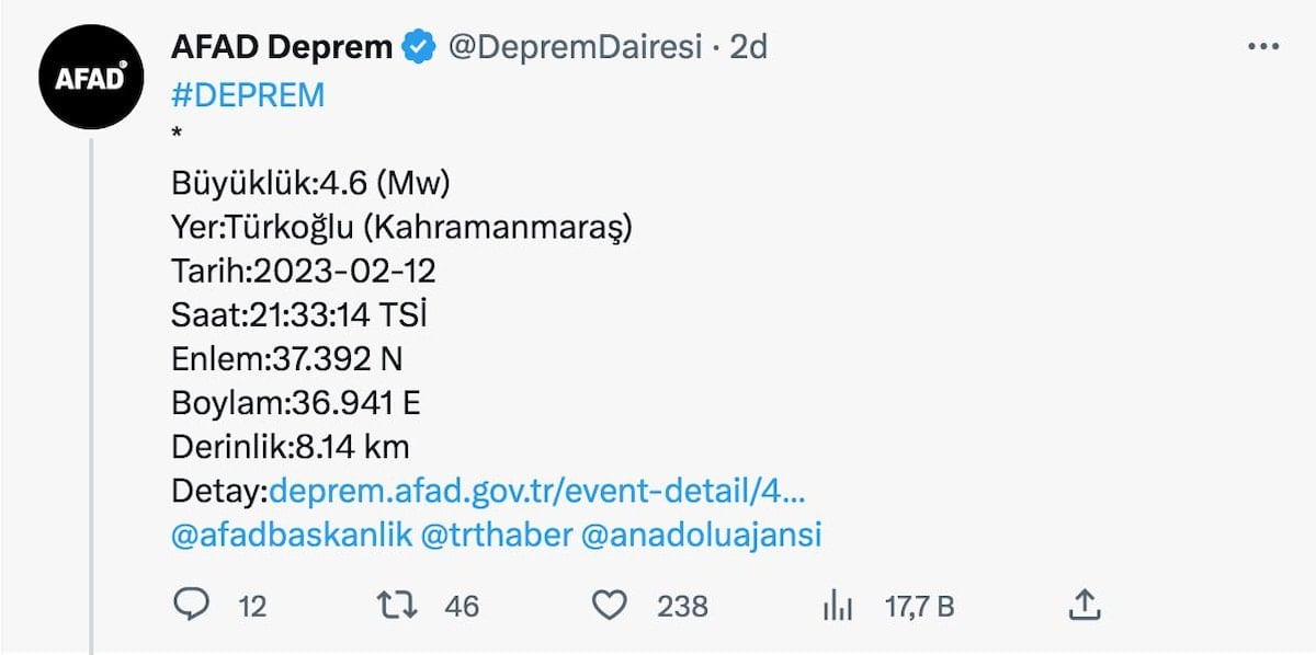 AFAD, Kahramanmaraş, Türoğlu merkezli bir deprem meydana geldiğini açıkladı.