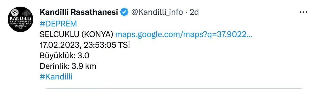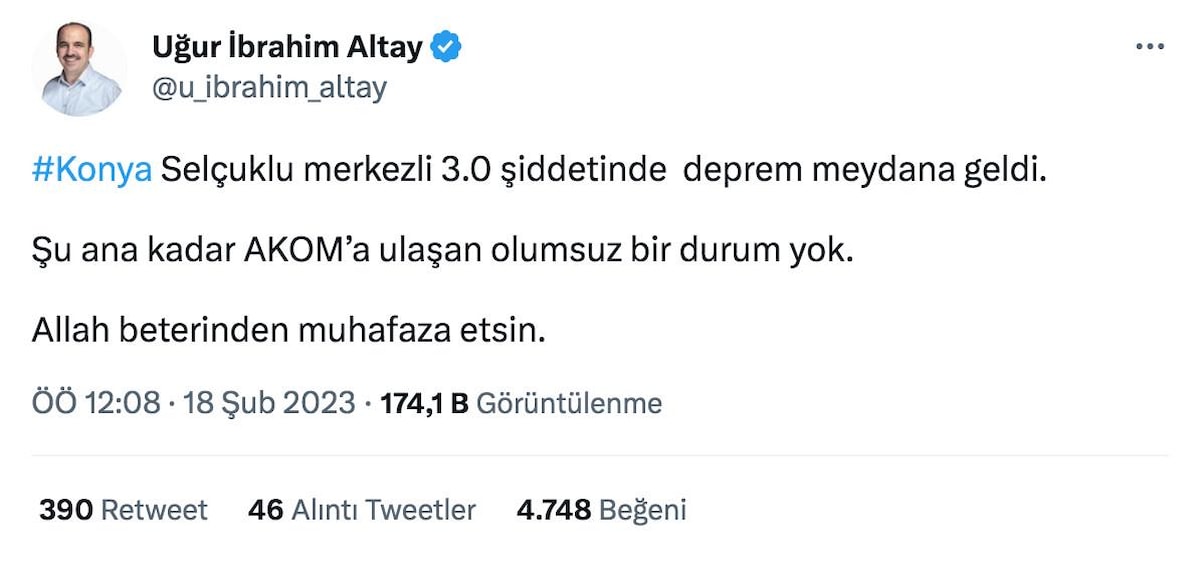 Uğur İbrahim Altay "Konya Selçuklu merkezli 3.0 şiddetinde deprem meydana geldi. Şu ana kadar AKOM’a ulaşan olumsuz bir durum yok. Allah beterinden muhafaza etsin." ifadelerine yer verdi.