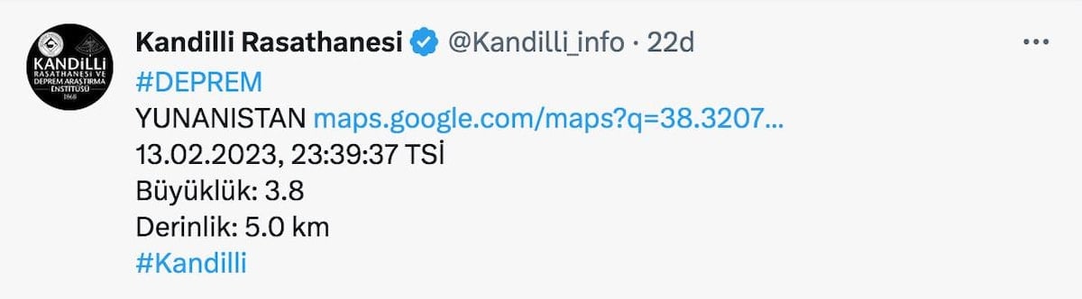 Kandilli Rasathanesi, Yunanistan merkezli bir deprem meydana geldiğini açıkladı.