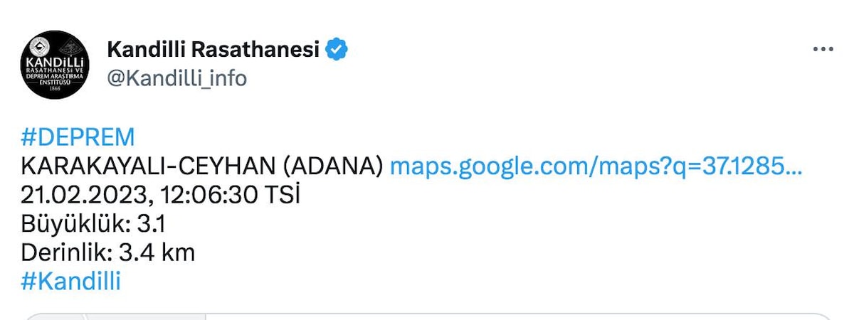 Kandilli Rasathanesi, Adana, Karakayalı-Ceyhan merkezli bir deprem meydana geldiğini açıkladı.