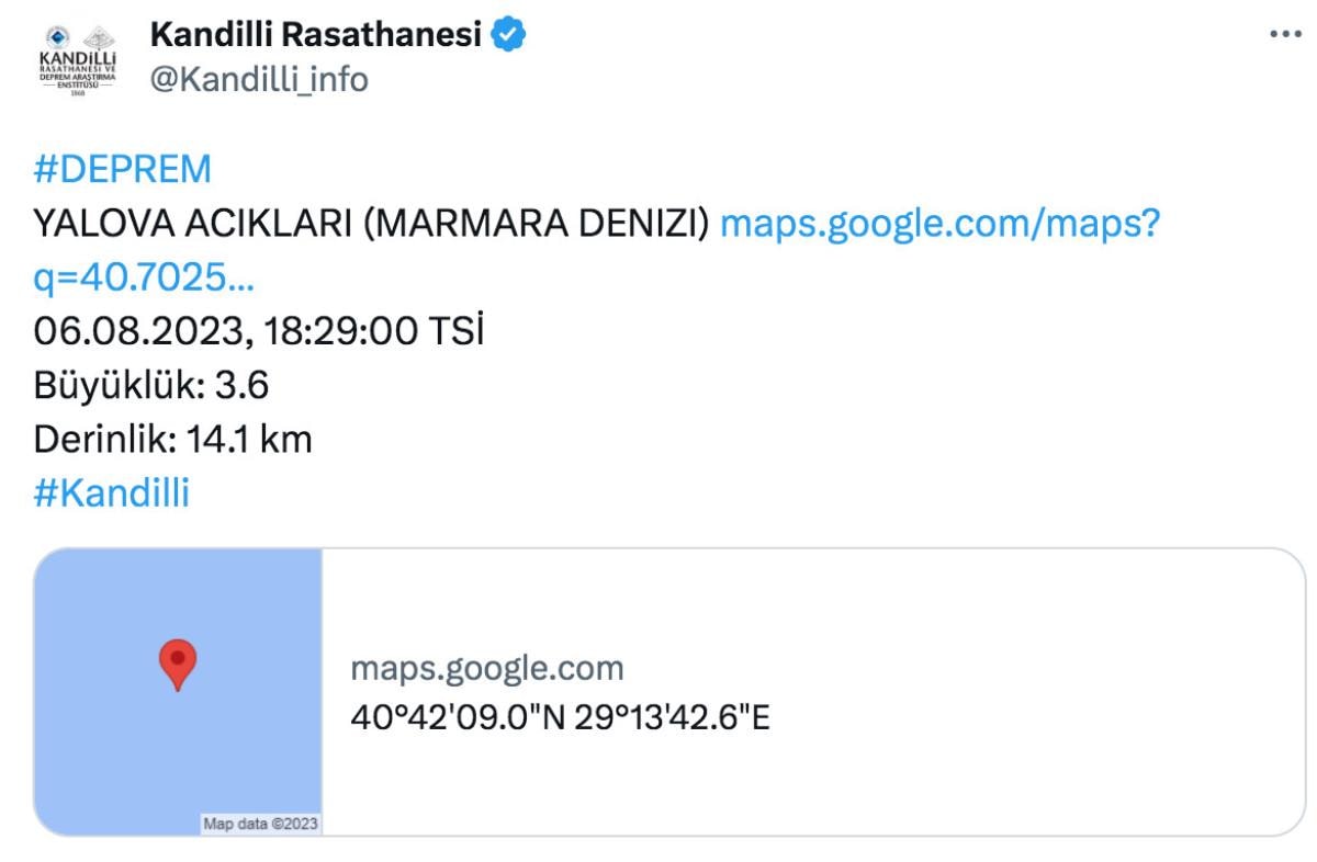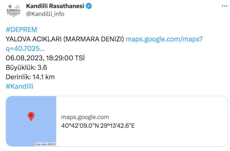 6 Ağustos Pazar günü Marmara Denizi'nde Türkiye saati ile 18:29:00'da 3.6 büyüklüğünde bir deprem meydana geldi. Deprem İstanbul ve Kocaeli gibi çevre illerden de hissedildi.