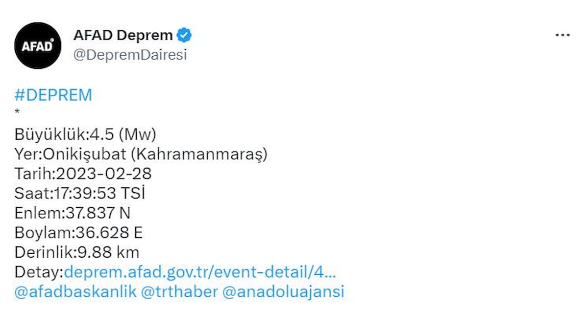 AFAD, Kahramanmaraş merkezli bir deprem meydana geldiğini açıkladı.