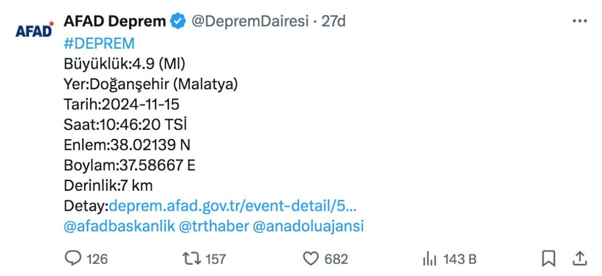 AFAD, 15 Kasım Cuma günü saat 10.46'da merkez üssü Malatya'nın Doğanşehir ilçesi olan ve 4.9 büyüklüğünde bir deprem meydana geldiğini duyurdu.