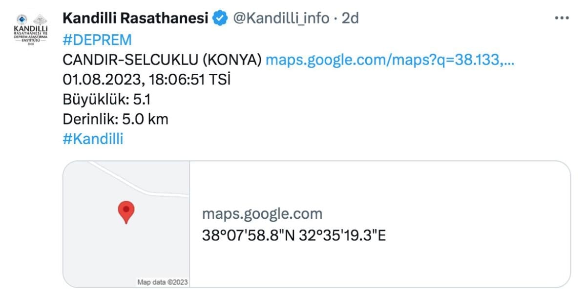 Konya'da Türkiye saati ile 18:06:51'de bir deprem meydana geldi. Kandilli Rasathanesi depremin büyüklüğünü 5.1 olarak açıkladı. Konya'da meydana gelen depremin çevre illerde hissedildiği kaydedildi.