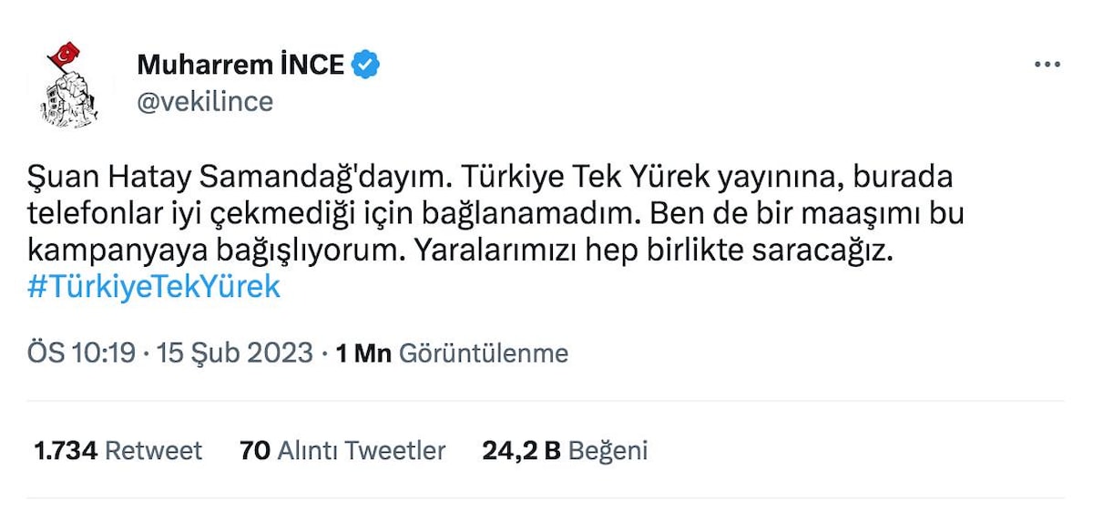 Yardım gecesine telefonla bağlanmak isteyen ancak hatlarda yaşanan sorunlardan dolayı katılamayan Memleket Partisi Genel Başkanı Muharrem İnce sosyal medya hesabından yaptığı paylaşım ile yaptığı bağışı açıkladı.