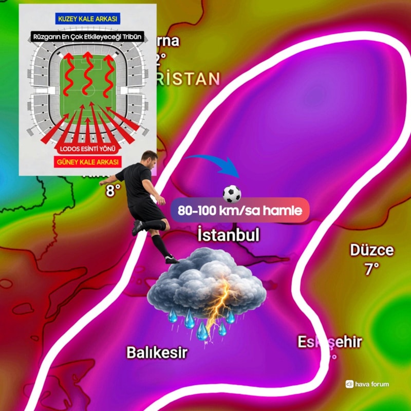 Fenerbahçe taraftarlarının yer alacağı Kuzey Kale Arkası tribününün lodostan en çok etkilenecek yer olacağını belirten Hava Forum, "Cumartesi 20.30'da Atatürk Olimpiyat Stadyumundaki Galatasaray-Fenerbahçe maçında kuvvetli lodos hamleleri ve yağmur bekliyoruz. Lodosu karşıdan alacak olan Fenerbahçelilerin bulunacağı Kuzey Kale Arkası tribünü lodostan en çok etkilenecek tribün olacak..." paylaşımını yaptı.