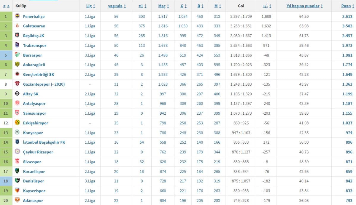 Sarı-lacivertliler, oynadığı 1.817 lig maçında 3 bin 612 puan alarak ligin en çok puan toplayan ekibi oldu. Bu alanda Galatasaray'ı 29 puan farkla geride bırakan Fenerbahçe, zirvedeki yerini koruyor.