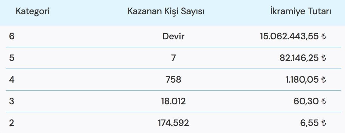 Büyük ikramiyenin 15.062.443,55 TL olduğu çekilişte 6 bilen çıkmadığı için büyük ikramiye devretti.